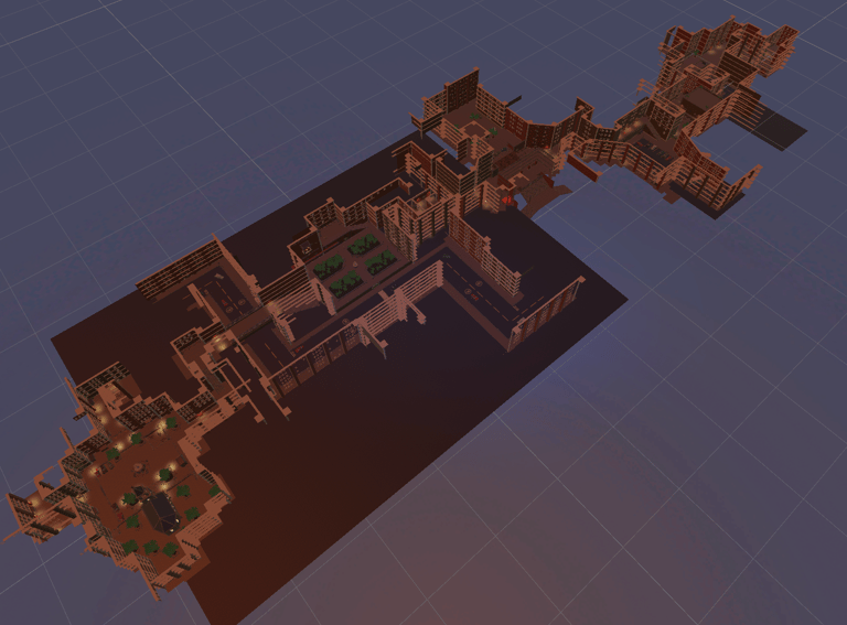 The level started with a drawing and blockout phase where I focused on establishing the main gameplay spaces and the general layout of the level. At this stage the priority was not visuals but gameplay clarity. I worked on defining the scale of the spaces, the main traversal routes, and the sightlines that would support combat and player navigation. Since the game revolves around escorting civilians, it was important that the layout naturally guided players forward while still creating areas where encounters could happen.